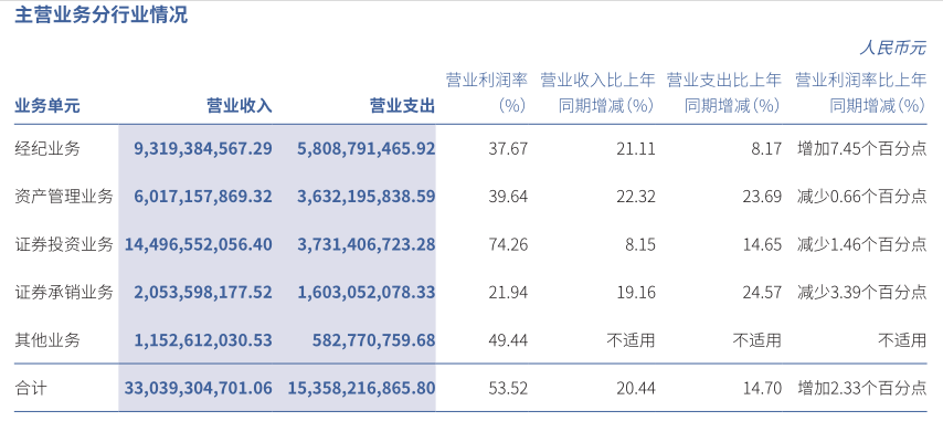 其中,经纪业务实现收入人民币93.19亿元,同比增长21.11%;资产管理业务实现收入人民币60.17亿元,同比增长22.32%;证券投资业务实现收入人民币144.97亿元,同比增长8.15%;证券承销业务实现收入人民币20.54亿元,同比增长19.16%;其他业务实现收入人民币11.52亿元。